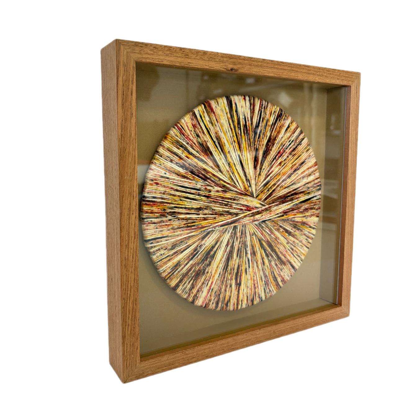 Arte tridimensional composta por fios mesclados em algodão, trançados e tensionados manualmente, formando um disco de textura rica e dinâmica.